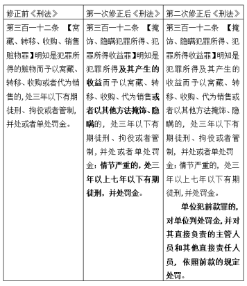 2006年6月29日起施行的《刑法修正案(六)》第十九條對本條作了第一次修改,將犯罪對象由“贓物”調(diào)整為“犯罪所得及其產(chǎn)生的收益”,并將行為方式調(diào)整為包括“以其他方法掩飾、隱瞞”;同時,對法定刑作了調(diào)整,將法定最高刑由三年調(diào)整為七年。修改后,罪名由“窩藏、轉(zhuǎn)移、收購、銷售贓物罪”調(diào)整為“掩飾、隱瞞犯罪所得、犯罪所得收益罪”。