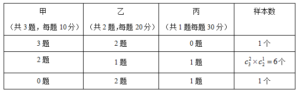 由上表可知最終得分70分的總樣本數(shù)為1+6+1=8個(gè),未選擇丙類題目樣本數(shù)為1個(gè),故所求概率為