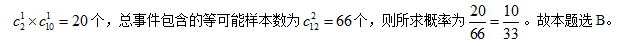 【答案】B【解析】根據(jù)題干,產(chǎn)品數(shù)是可數(shù)、有限的;從箱子中隨機(jī)抽取的每一個(gè)產(chǎn)品的可能性相等,所求為古典概率。A事件為抽取的2件產(chǎn)品中恰好有1件次品;總事件為從12件產(chǎn)品中任意抽取2件產(chǎn)品。已知12件產(chǎn)品中有2件次品,10件合格品,A事件包含的等可能樣本數(shù)為