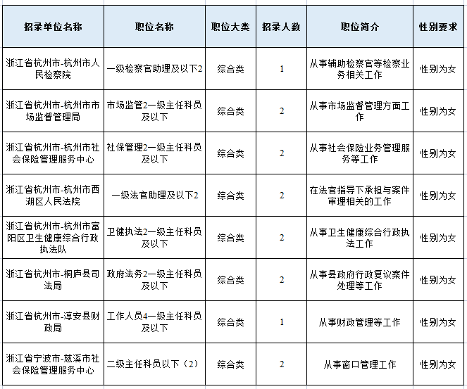 2022年浙江省全省各級機(jī)關(guān)單位計(jì)劃考試錄用公務(wù)員(含參照公務(wù)員法管理的工作人員)6211人。職位表分為了三大類:普通崗位、行政執(zhí)法類和專業(yè)技術(shù)類。其中共有406個(gè)職位、人數(shù)522名限招女生;共有3033個(gè)職位、人數(shù)3582名不限性別,男女均可報(bào)考。