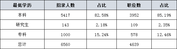從學(xué)歷要求來看,以本科為學(xué)歷起點(diǎn)的職位最多,為3952個,占85.19%,較去年的84%略有提升;有12.46%的職位為??粕ㄩ_大門,招錄人數(shù)為1000人,占到總招錄人數(shù)的15.24%,與去年的情況基本持平,專科考生要把握好機(jī)會;而以研究生為門檻的職位占到2.35%%,與去年相比略降。