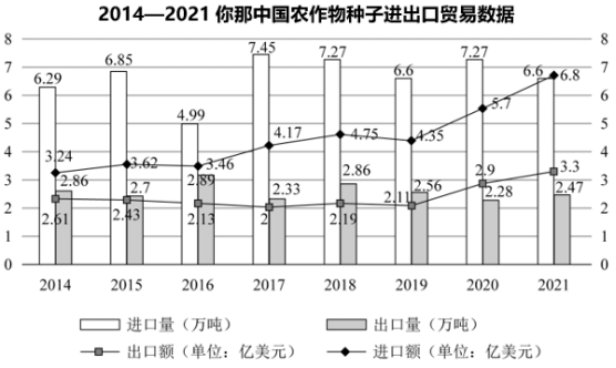 111.2014—2021年間,我國農(nóng)作物種子進(jìn)出口貿(mào)易逆差超2億美元的年份有幾個(gè):( )