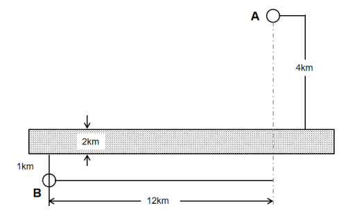 15.A、B兩個(gè)鄉(xiāng)鎮(zhèn)分布于山谷兩側(cè),山谷間有一條寬為2km的河道(如下圖所示)。當(dāng)?shù)卣疀Q定在兩個(gè)鄉(xiāng)鎮(zhèn)間修建一條跨河公路促進(jìn)旅游發(fā)展。由于架橋費(fèi)用高昂,所以要求跨河公路中的橋梁路段長(zhǎng)度最短。那么根據(jù)圖中數(shù)據(jù),從A鎮(zhèn)前往B鎮(zhèn)的最短距離為:( )