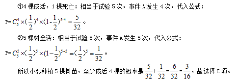 例1:植樹節(jié)期間,某單位購進(jìn)一批樹苗,在林場工人的指導(dǎo)下組織員工植樹造林。假設(shè)樹苗的成活率為50%,那么,該單位職工小張種植5棵樹苗,至少成活4棵的概率是多少?( )