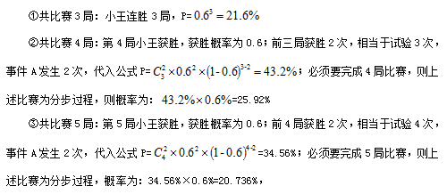 【答案】D【解析】每局比賽是否獲勝互不影響,且只有獲勝和不獲勝兩種情況,每局獲勝概率均為0.6,符合多次獨(dú)立重復(fù)試驗(yàn)?zāi)P?,事件A為小王獲勝。由于比賽的特殊性,小王在獲取三局勝利后比賽結(jié)束,故最后一局必然為小王獲勝。最終小王獲勝可分成三種情況: