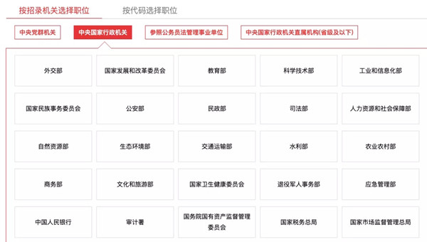 有兩種方式選擇查看想報(bào)的職位:①按招錄機(jī)關(guān)選擇;