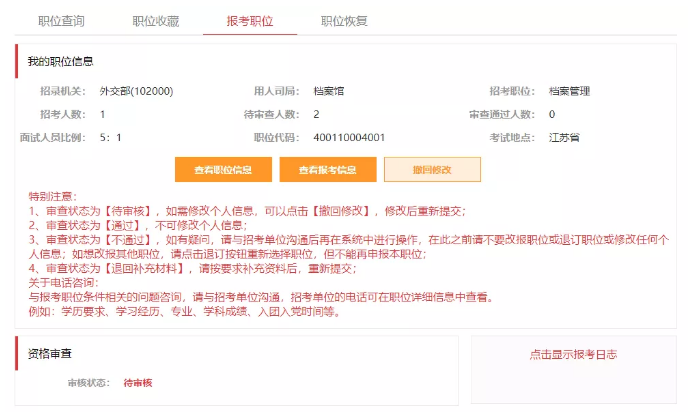 職位確定提交報(bào)考后,即可等待審核。在審核未通過(guò)之前,考生可以更改報(bào)考崗位,點(diǎn)擊“撤回修改”即可將原來(lái)報(bào)考的崗位撤回,審核通過(guò)以后,考生不得改報(bào)其他崗位。