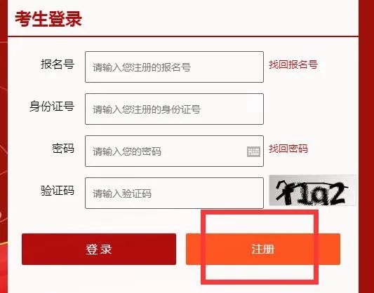 進(jìn)入報名專題后,首先要點擊右側(cè)登錄窗口下方右側(cè)橙色注冊入口,注冊賬號。