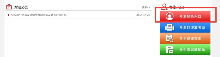 進(jìn)入河北省2022年度公務(wù)員錄用省市縣鄉(xiāng)四級聯(lián)考暨選拔選調(diào)生考試專題后點擊右側(cè)的考生登錄入口。