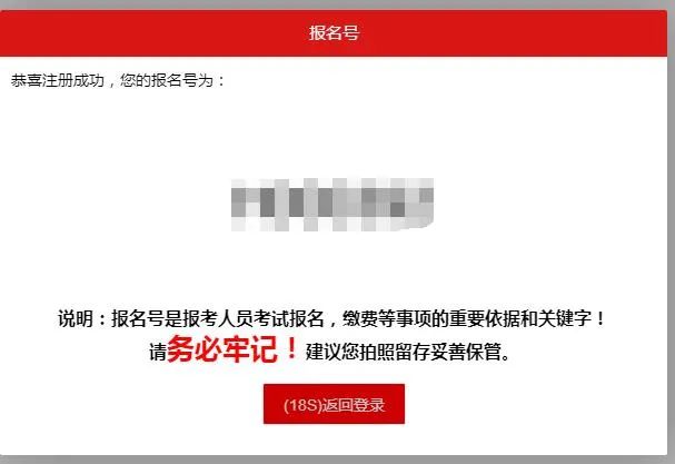 點擊注冊后會看到考生的報名號,報名號是系統(tǒng)登錄必須信息,無論是報名、繳費、打印準(zhǔn)考證、成績查詢等都需要登錄報考系統(tǒng),因此考生務(wù)必保存好自己的報名號,如報名號丟失可在登錄界面點擊找回報名號進(jìn)行找回。