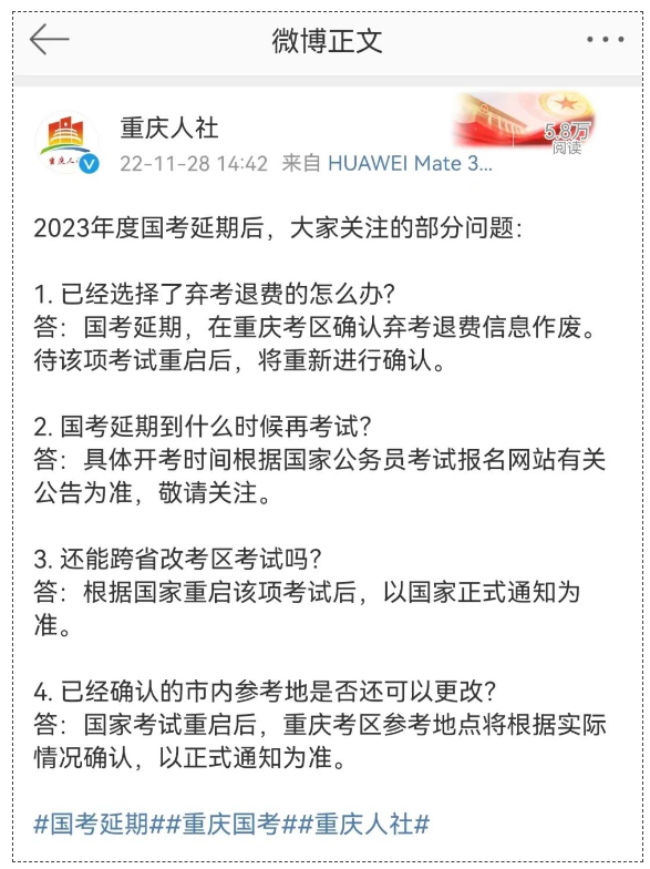 國(guó)考延期,暫未知何時(shí)重啟,眼下大家有很多關(guān)心的問(wèn)題,重慶人社第一時(shí)間給大家進(jìn)行了解答: