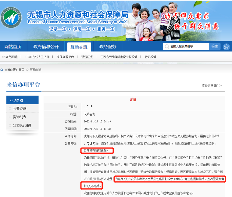 有考生在無錫人社局官網(wǎng)進行了咨詢,官方回復稱:目前沒有延期通知。同時建議考生為避免7天內(nèi)旅居市出現(xiàn)本土聚集性疫情影響參加考試,考生應提前抵錫,且盡量做到考前7天不離錫。
