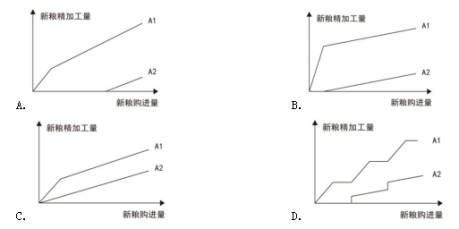 【答案】A【解析】A2曲線:若想要新糧加工量最少,需要先加工舊糧,說明A2必須有一段縱軸值為0的橫線,排除C項(xiàng);A1曲線:若想要新糧加工量最多,則需要先加工新糧,舊糧Y是不變量,不存在周期性,排除D;觀察A、B選項(xiàng),區(qū)別在于A1曲線第一段的斜率,代表的是盡量多的使用新糧的起始階段,此時(shí)應(yīng)該全部使用新糧,斜率為1,A項(xiàng)符合。故選A。