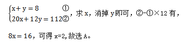 方法二,如果8天全是雨天,可運(yùn)12×8=96次,比實(shí)際少運(yùn)了112-96=16次。每多一個(gè)晴天比一個(gè)雨天多運(yùn)20-12=8次,則運(yùn)送期間經(jīng)歷的晴天有16÷8=2天,故本題選A。