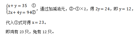 假設(shè)有x只雞,有y只兔,則根據(jù)總共有35個(gè)頭和94只腳,可得