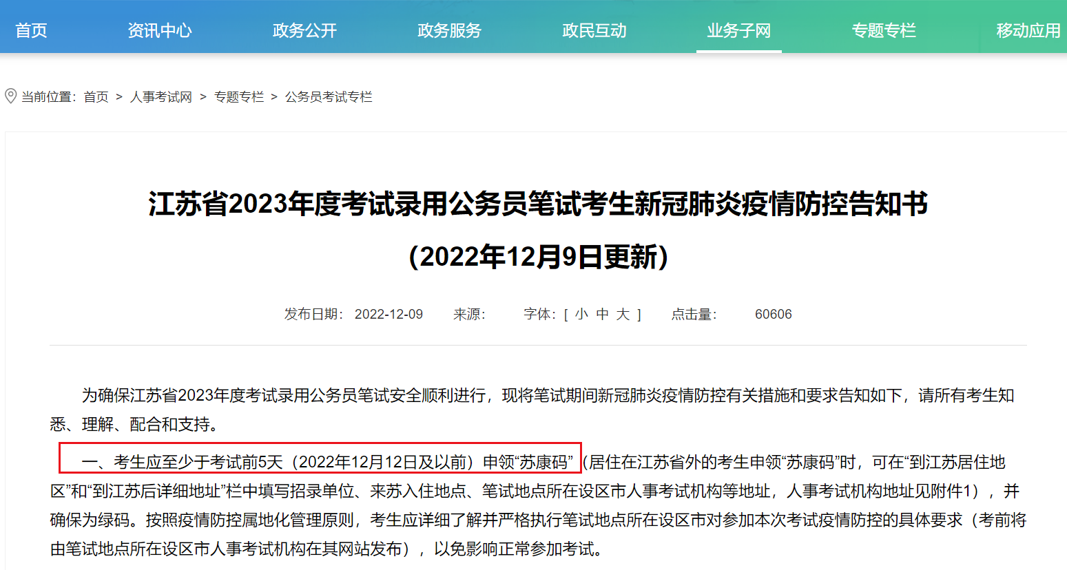 根據(jù)周五江蘇人社局以及各地市人事考試網(wǎng)發(fā)布的疫情防控告知書(shū)以及補(bǔ)充告知書(shū),明確要求考生應(yīng)考生應(yīng)至少于考試前5天(2022年12月12日及以前)申領(lǐng)“蘇康碼”并確保為綠碼。