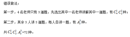 那這種思路錯在哪里呢?我們還是來舉例討論一下,如果第一步中選擇甲老師講解題一,第二步中乙、丙、丁三位老師分別講題一、二、三,此時是甲乙講題一、丙講題二、丁講題三,這是一種分配方案;現(xiàn)在我們調整一下,如果第一步中選擇乙老師講解題一,第二步中甲、丙、丁三位老師分別講題一、二、三,這在我們上述的算法中也算另一種分配方案,但是我們可以看到結果都是甲乙講解題一,丙講解題二,丁講解題三,這兩種結果是一樣的,所以出現(xiàn)了重復計數(shù)。