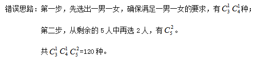 上述思路錯在哪里呢?我們來詳細分析一下:第一步中選擇一男一女時未被選中的5名人選進入了第二步考慮名單中,而如果假設男生中有甲、乙,女生中有丙、丁,根據(jù)上述分步的思路,第一步若選擇甲和丙,第二步選擇了乙和丁,此時人選為甲乙丙丁,算一種選法;現(xiàn)在改一下每一步的結果,如果第一步選擇乙和丁,第二步選擇甲和丙,此時人選依然為甲乙丙丁,這個在我們上述的列式計算中算成了兩種選法,但其實這兩種結果是一樣的,所以出現(xiàn)了重復計數(shù),因此結果肯定偏大。那正確做法應該怎么做呢?