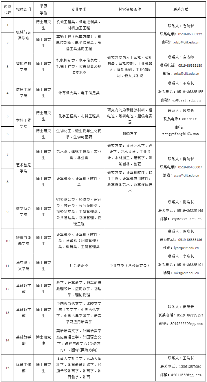 請(qǐng)應(yīng)聘者填寫《常州工業(yè)職業(yè)技術(shù)學(xué)院公開(kāi)招聘人員報(bào)名表》(見(jiàn)附件),并發(fā)送至各招聘部門郵箱或人事處郵箱zhaopin@ciit.edu.cn。發(fā)送郵件主題格式:崗位代碼+招聘部門+姓名+專業(yè)+學(xué)歷學(xué)位。