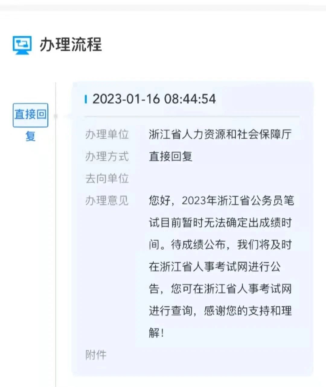 日前,有熱心考生去政府官方網(wǎng)站留言詢問(wèn)何時(shí)可以查詢省考成績(jī),官方的回復(fù)是:2023年浙江省公務(wù)員筆試目前暫時(shí)無(wú)法確定出成績(jī)時(shí)間。詳情如下: