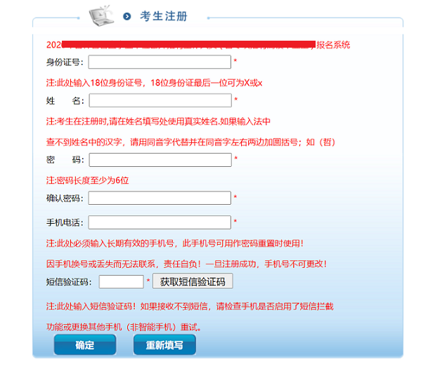 未注冊考生請注冊后再登錄,點(diǎn)擊圖1-4中的‘注冊新用戶’進(jìn)入注冊頁面如圖1-5,請考生按提示填寫注冊信息。點(diǎn)擊‘確定’提交注冊信息,注冊成功后將返回圖1-4頁面進(jìn)行登錄(返回登陸時(shí)自動(dòng)把身份證號填充到身份證號文本框內(nèi))。