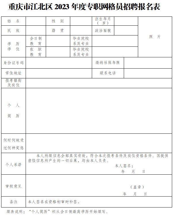 本次考試采取網(wǎng)上報名(電子郵件)方式進行,實行誠信報考制度,同一報考人員只能報考1個崗位,若發(fā)現(xiàn)同時報考2個及以上崗位的,取消招聘資格。報考前,報考人員應(yīng)仔細閱讀本簡章。報考時,報考人員應(yīng)如實填寫各項報名信息,并將報名表發(fā)送至所報考崗位對應(yīng)電子郵箱(詳見《重慶市江北區(qū)2023年專職網(wǎng)格員招聘職位表》)。在招聘過程中,發(fā)現(xiàn)報考人員不誠信填報個人信息的,取消報考資格。