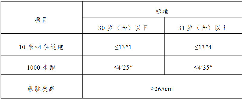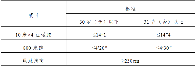 在體能測評中,男子1000米跑、女子800米跑項目測評次數(shù)均為1次,10米×4往返跑項目測評次數(shù)不超過2次,縱跳摸高項目測評次數(shù)不超過3次??忌跍y評10米×4往返跑前,可以練習,熟悉規(guī)則。體能測評的三個項目中有任何一項不合格或違規(guī),視為體能測評不合格。