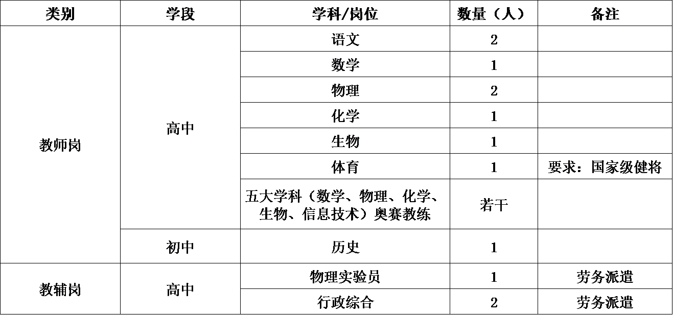 5.除特殊說(shuō)明外,應(yīng)屆畢業(yè)生需具備碩士及以上學(xué)歷(清華北大本科即可;應(yīng)聘初中教師者,優(yōu)秀的公費(fèi)師范生亦可考慮),在校學(xué)習(xí)成績(jī)優(yōu)秀,有學(xué)生干部經(jīng)歷者優(yōu)先;在職教師需具備碩士及以上學(xué)歷,要求在中學(xué)有三年及以上的任教經(jīng)歷,具備中級(jí)及以上職稱(chēng)。