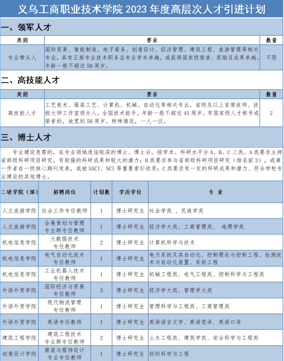 義烏工商職業(yè)技術(shù)學(xué)院是浙江省高職高水平學(xué)校、浙江省優(yōu)質(zhì)高職院校,榮登全國(guó)創(chuàng)新創(chuàng)業(yè)典型經(jīng)驗(yàn)高校,獲評(píng)國(guó)家級(jí)創(chuàng)新創(chuàng)業(yè)教育實(shí)踐基地?,F(xiàn)因?qū)W校發(fā)展需要,面向社會(huì)招聘一批高層次人才和專任教師。