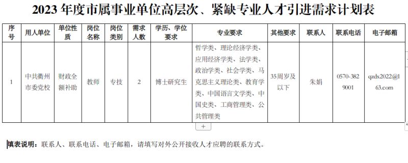 根據(jù)我單位發(fā)展需要和《浙江省事業(yè)單位公開招聘人員暫行辦法》《關(guān)于打造事業(yè)單位人才高地大力提升人才競爭力和服務(wù)績效的實(shí)施意見》規(guī)定,經(jīng)研究,中共衢州市委黨校決定引進(jìn)事業(yè)單位高層次緊缺人才。現(xiàn)將有關(guān)事項(xiàng)公告如下: