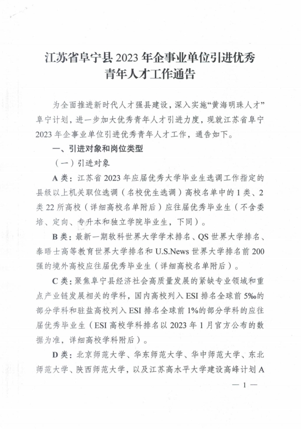 江蘇省阜寧縣2023年企事業(yè)單位引進優(yōu)秀青年人才工作通告