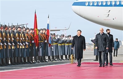 俄方在機(jī)場(chǎng)舉行隆重迎賓儀式。軍樂(lè)團(tuán)奏中俄兩國(guó)國(guó)歌。習(xí)近平檢閱俄羅斯三軍儀仗隊(duì)并觀看分列式。