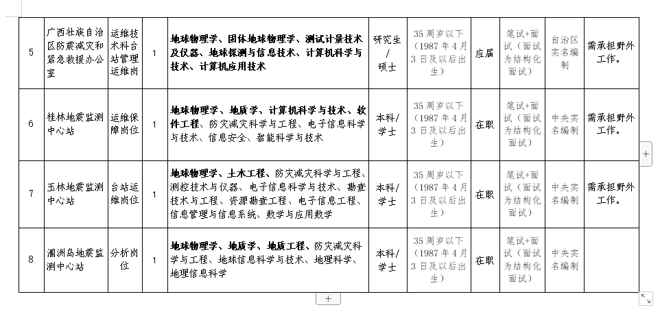 4.應(yīng)聘人員務(wù)必準確填寫聯(lián)系方式,保持通訊暢通。自治區(qū)地震局報名咨詢電話:0771-2811725(工作日08:00-12:00,15:00-18:00)。