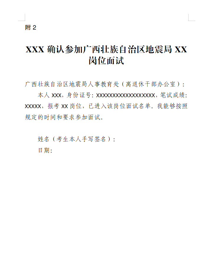 (2)電子郵件標題統(tǒng)一寫成“XXX確認參加廣西壯族自治區(qū)地震局XX崗位面試”,手寫簽名圖片或掃描件發(fā)送,內(nèi)容見附2。如網(wǎng)上報名時填報的通訊地址、聯(lián)系方式等信息發(fā)生變化,請在電子郵件和傳真中注明。