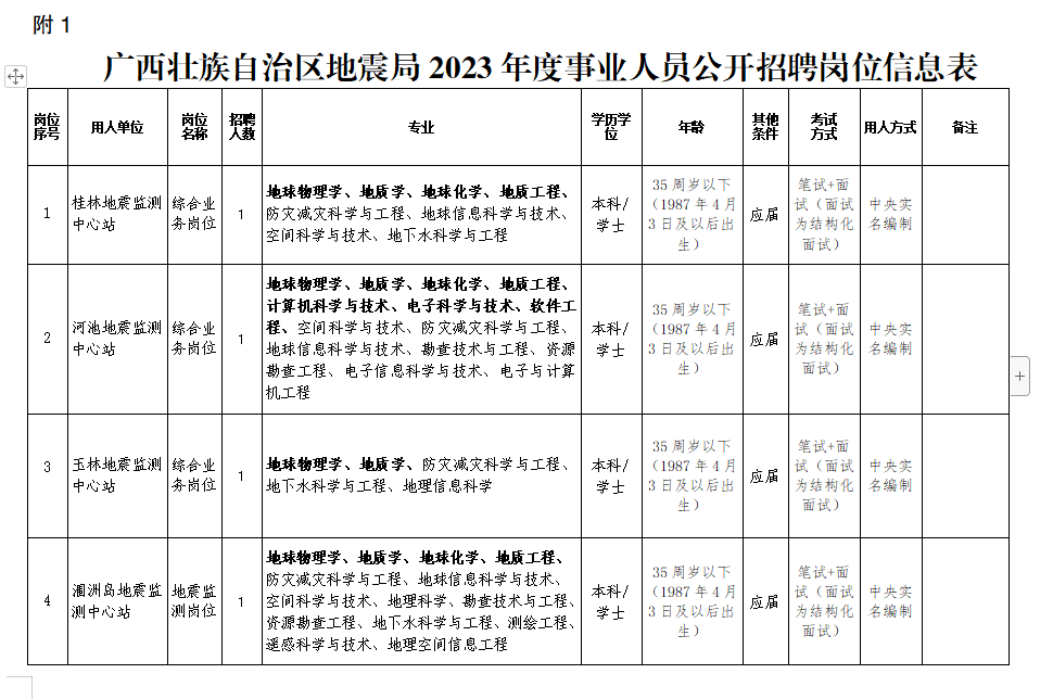附1 廣西壯族自治區(qū)地震局2023年度事業(yè)人員公開招聘崗位信息表.doc