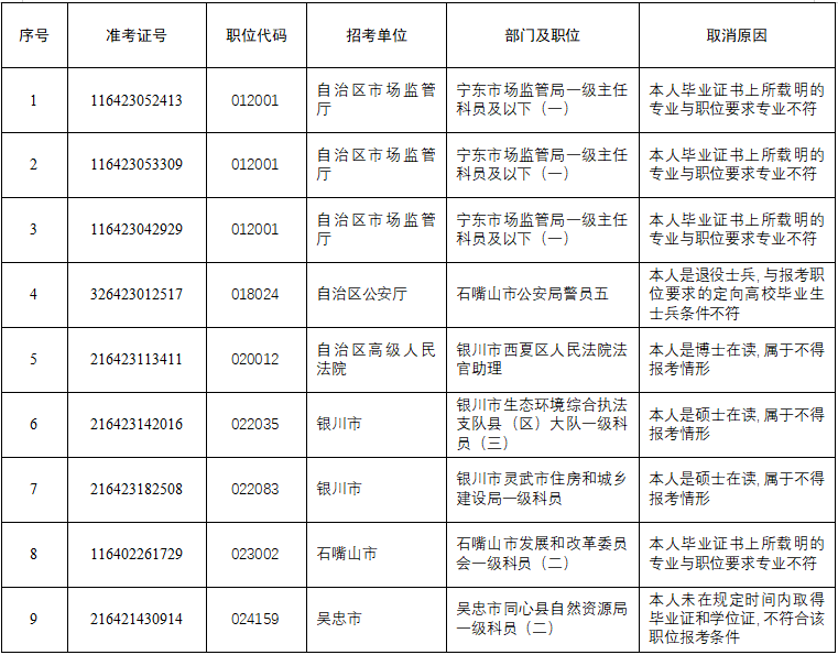 根據(jù)《寧夏回族自治區(qū)2023年考試錄用公務員公告》相關(guān)規(guī)定,自治區(qū)公務員局會同有關(guān)部門及各招錄機關(guān)對2023年全區(qū)考試錄用公務員擬進入面試的報考者進行了資格復審。復審中發(fā)現(xiàn),部分報考者不符合職位資格條件,部分報考者放棄面試資格,個別職位達不到面試開考比例。經(jīng)自治區(qū)公務員主管部門研究,決定取消部分報考者面試資格,降低部分職位面試開考比例?,F(xiàn)將有關(guān)情況公告如下: