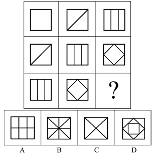 每道題給出一套或兩套圖形,要求應(yīng)試人員通過(guò)觀察分析,找出圖形排列的規(guī)律,選出符合規(guī)律的一項(xiàng)。