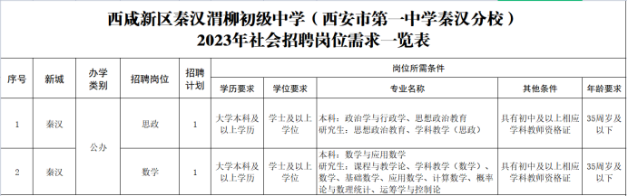 西咸新區(qū)秦漢渭柳初級中學2023年招聘公告