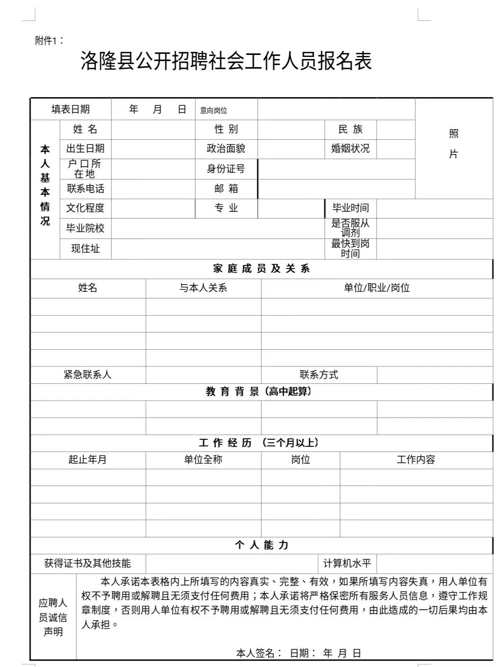 (1)洛隆縣公開招聘鄉(xiāng)鎮(zhèn)社會工作人員報名表(電子版與紙質(zhì)版),詳見附件1;