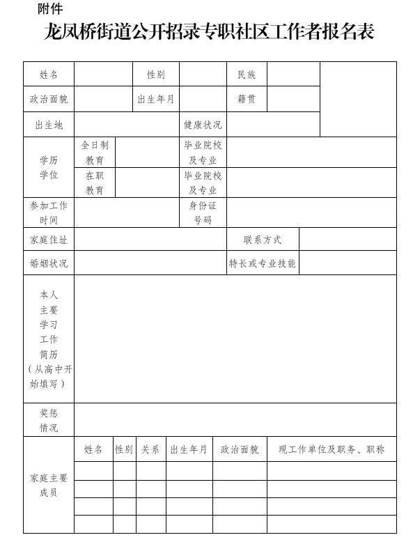 附件:龍鳳橋街道公開招錄專職社區(qū)工作者報名表