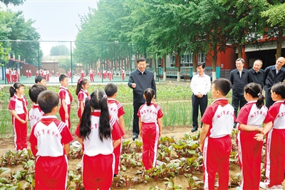 隨后,習(xí)近平來(lái)到學(xué)生農(nóng)場(chǎng)。這里是學(xué)生開展農(nóng)業(yè)種植活動(dòng)的實(shí)踐場(chǎng)所,陽(yáng)光下、田壟上,一排排綠油油的菜苗生機(jī)勃勃。孩子們拿著水桶、鏟子、耙子、毛筆,為西紅柿、黃瓜等澆水、松土、除草、授粉。習(xí)近平強(qiáng)調(diào),很多知識(shí)和道理都來(lái)自勞動(dòng)、來(lái)自生活。引導(dǎo)孩子們從小樹立勞動(dòng)觀念,培養(yǎng)勞動(dòng)習(xí)慣,提高勞動(dòng)能力,有利于他們更好地學(xué)習(xí)知識(shí)?,F(xiàn)在一些城里的孩子接觸農(nóng)村、接觸大自然少,不光“四體不勤”,而且“五谷不分”,對(duì)吃的是什么、從哪里來(lái)的、怎么來(lái)的都不知道,更體會(huì)不到“誰(shuí)知盤中餐,粒粒皆辛苦”。他對(duì)同學(xué)們說(shuō),認(rèn)識(shí)大自然,首先要從認(rèn)識(shí)身邊的植物開始。同學(xué)們?cè)耘嗟母鞣N植物,雖然書本上都有介紹,但大家親手種、親自培育、跟蹤觀察,收獲肯定是不一樣的。希望同學(xué)們從“學(xué)農(nóng)”中感受到農(nóng)作的艱辛和農(nóng)民的不易,從小養(yǎng)成熱愛勞動(dòng)、珍愛糧食、尊重自然的良好習(xí)慣,為建設(shè)美麗中國(guó)作貢獻(xiàn)。新時(shí)代生態(tài)文明建設(shè)要從娃娃抓起,通過(guò)生動(dòng)活潑的勞動(dòng)體驗(yàn)課程,讓孩子親自動(dòng)手、親身體驗(yàn)、自我感悟,讓“綠水青山就是金山銀山”的理念早早植入孩子的心靈。