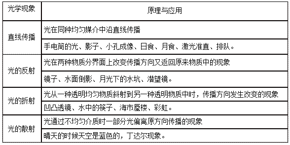 (1)直線傳播:手電筒的光、影子、小孔成像、日食、月食。