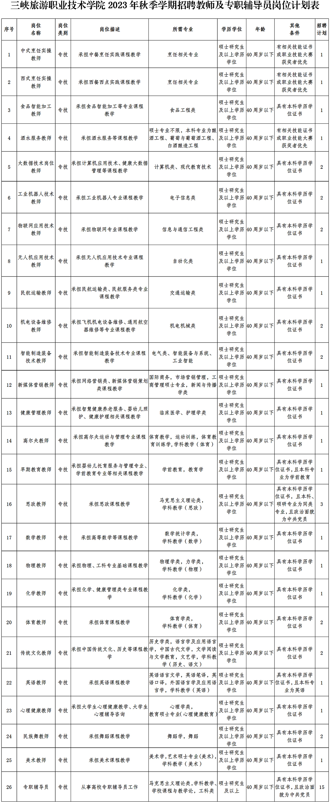 三峽旅游職業(yè)技術(shù)學(xué)院2023年秋季學(xué)期招聘教師及專職輔導(dǎo)員崗位計(jì)劃表.docx