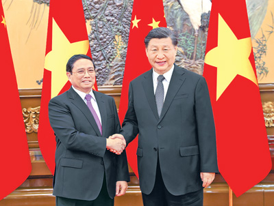 習近平指出,去年中共二十大閉幕后,我邀請阮富仲總書記來訪,共同為中越關系發(fā)展定向把舵。今年是中越建立全面戰(zhàn)略合作伙伴關系15周年,兩國各層級交往日益密切,我同阮富仲總書記達成的共識正在得到落實。中方視越方為周邊外交的優(yōu)先方向和具有戰(zhàn)略意義的命運共同體,這是中方基于兩國關系長遠發(fā)展作出的戰(zhàn)略選擇。面對日益嚴峻復雜的國際形勢,中越兩國要秉持平等互利、團結互信、合作共贏精神,攜手合作、共謀發(fā)展,更好造福兩國人民,為變亂交織的世界注入更多穩(wěn)定性。