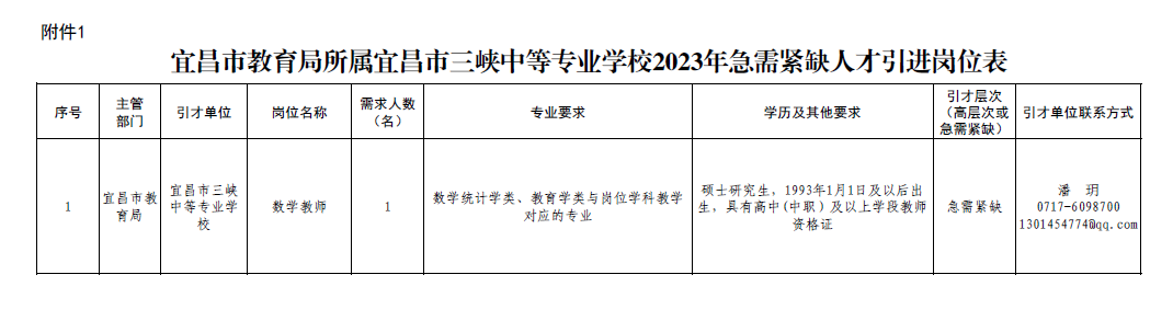 附件1. 宜昌市教育局所屬事業(yè)單位宜昌市三峽中等專業(yè)學(xué)校2023年急需緊缺人才引進招聘崗位表.pdf