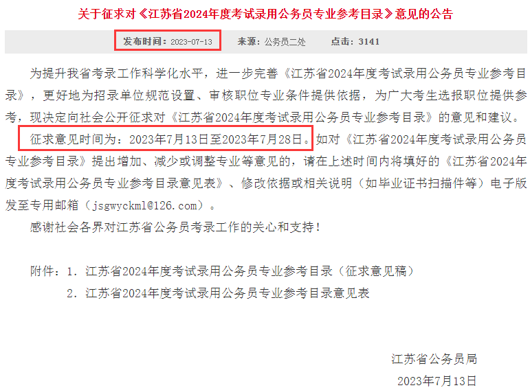 將于2023年7月13日至2023年7月28日期間內(nèi)征求廣大考生和社會各界對《江蘇省2024年度考試錄用公務(wù)員專業(yè)參考目錄》的修改意見和建議。