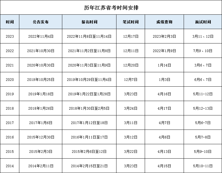 根據(jù)上表,我們可以發(fā)現(xiàn):2014~2019年江蘇公務(wù)員考試時間還算穩(wěn)定,而2020~2023年江蘇省考與往年相比,報名考試時間提前約3個月!