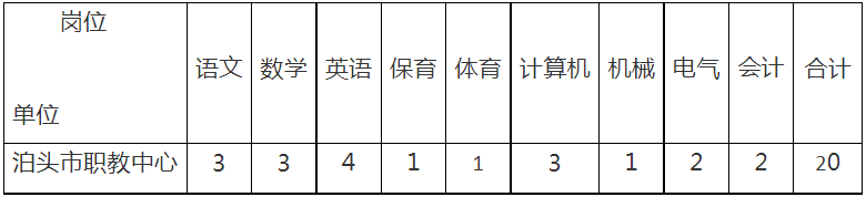 經(jīng)市政府批準(zhǔn),泊頭市職業(yè)技術(shù)教育中心公開招聘教師20名。