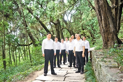 25日下午,習(xí)近平首先來到廣元市劍閣縣考察了翠云廊。這里是古代關(guān)中平原通往四川盆地古蜀道的重要路段,有迄今保存最完好的古代人工栽植驛道古柏群。習(xí)近平聽取古蜀道發(fā)展歷程、翠云廊整體情況介紹,沿古道步行察看千年古柏長勢(shì),詳細(xì)詢問歷史上植柏護(hù)柏情況。他指出,這片全世界最大的人工古柏林,之所以能夠延續(xù)得這么久、保護(hù)得這么好,得益于明代開始頒布實(shí)行“官民相禁剪伐”、“交樹交印”等制度,一直沿襲至今、相習(xí)成風(fēng),更得益于當(dāng)?shù)匕傩帐来餐刈o(hù)。這啟示我們,抓生態(tài)文明建設(shè)必須搭建好制度框架,抓好制度執(zhí)行,同時(shí)充分調(diào)動(dòng)廣大人民群眾的積極性主動(dòng)性創(chuàng)造性,鞏固發(fā)展新時(shí)代生態(tài)文明建設(shè)成果。臨行前,他囑咐當(dāng)?shù)刎?fù)責(zé)同志,要把古樹名木保護(hù)好,把中華優(yōu)秀傳統(tǒng)文化傳承好。