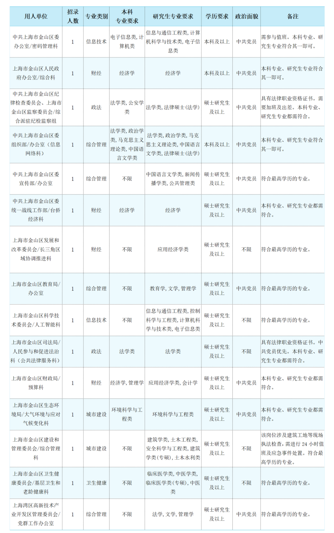 符合2024年上海市選調(diào)生招考公告中的高校范圍和基本條件(詳見(jiàn)下方報(bào)名網(wǎng)址),且所學(xué)專(zhuān)業(yè)及學(xué)歷等符合金山區(qū)招錄職位要求。